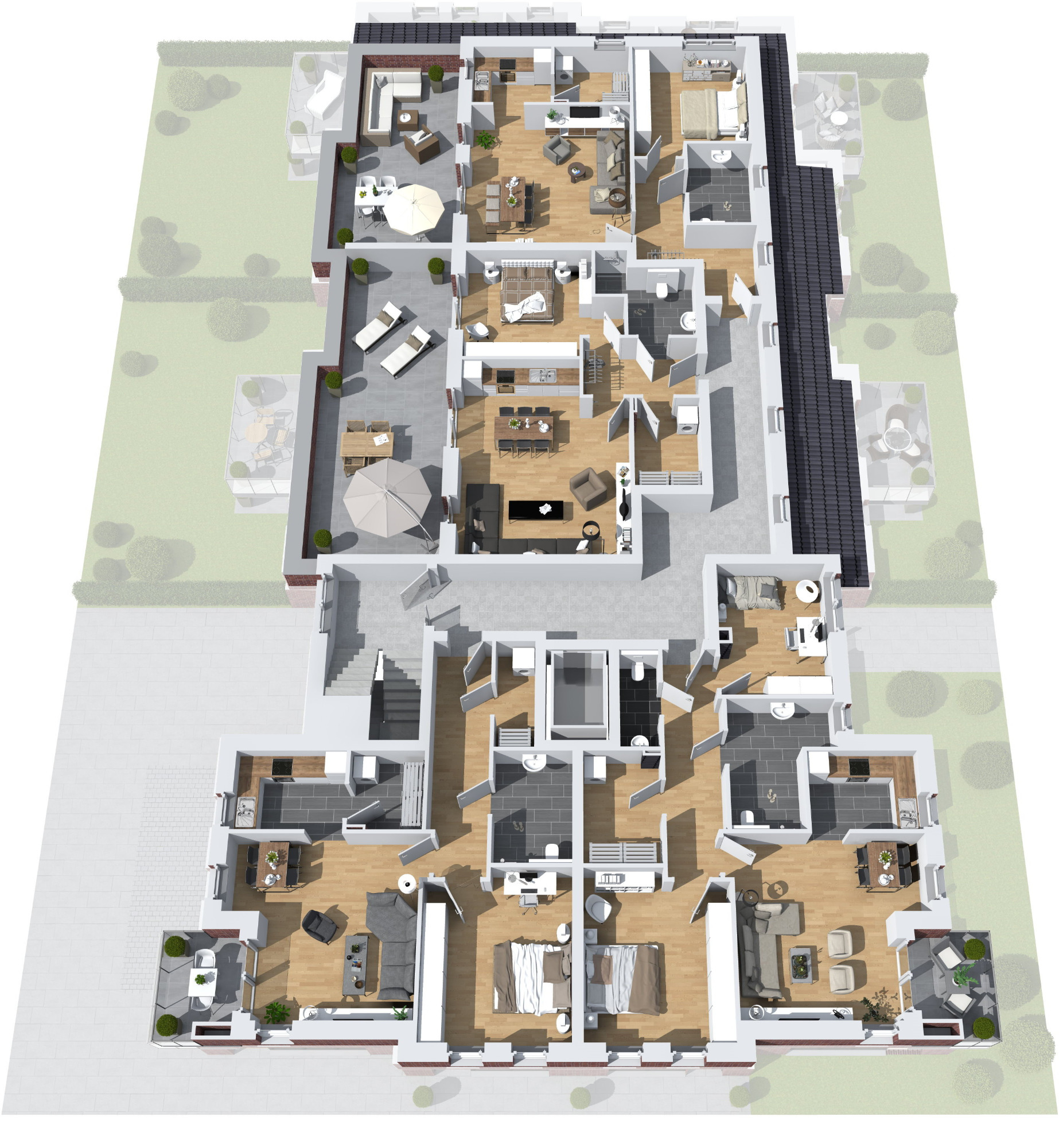- Terrasse im EG, Balkon im 1. Obergeschoss, Balkon oder Dachterrasse im 2. Obergeschoss