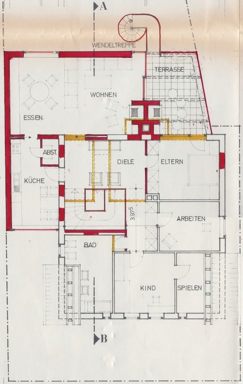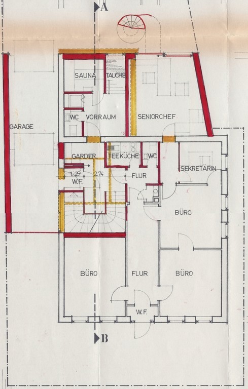 Da es über den aktuellen Bautenstand dieses Wohn- und Geschäftshauses keine Baupläne gibt, sehen Sie hier die Baupläne aus dem Jahr 1975. Diese wurden zwar beim Bauamt eingereicht, kamen aber – bislang – nicht zur Ausführung.