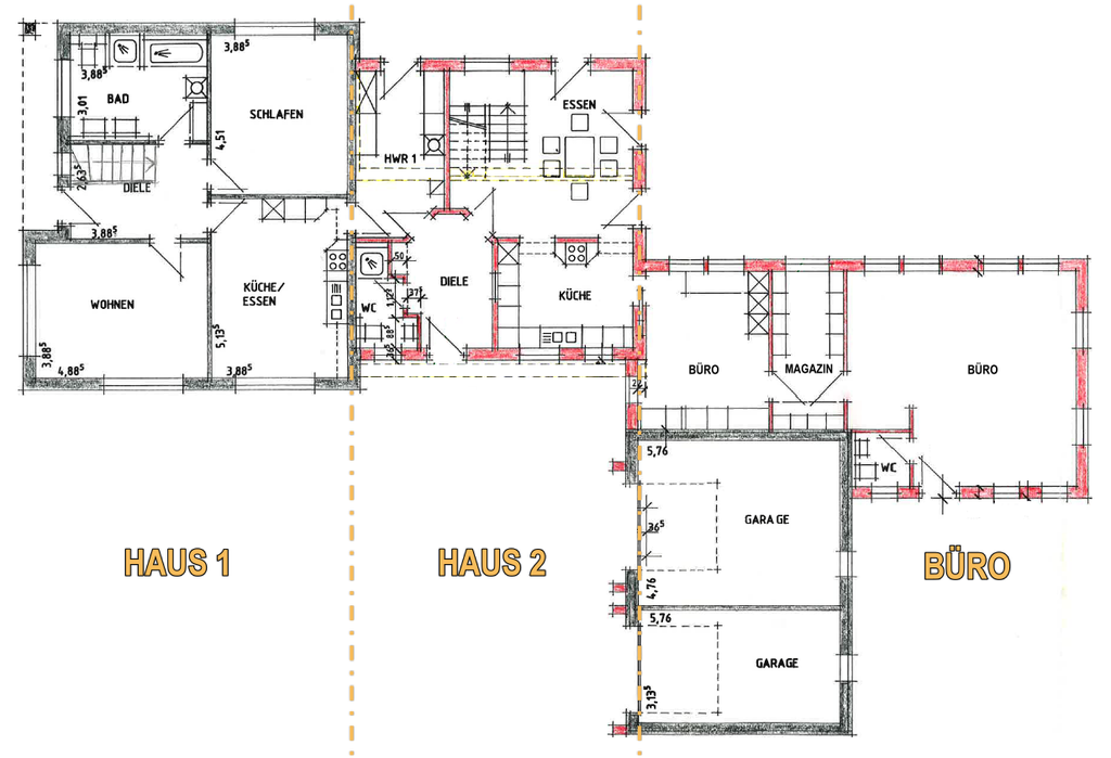 - Gebäude mit 3 separat oder auch durchgängig nutzbaren Gebäudeteilen