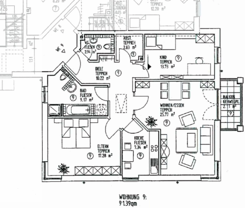 Bad mit Wanne und Dusche: ca. 9,17 m²