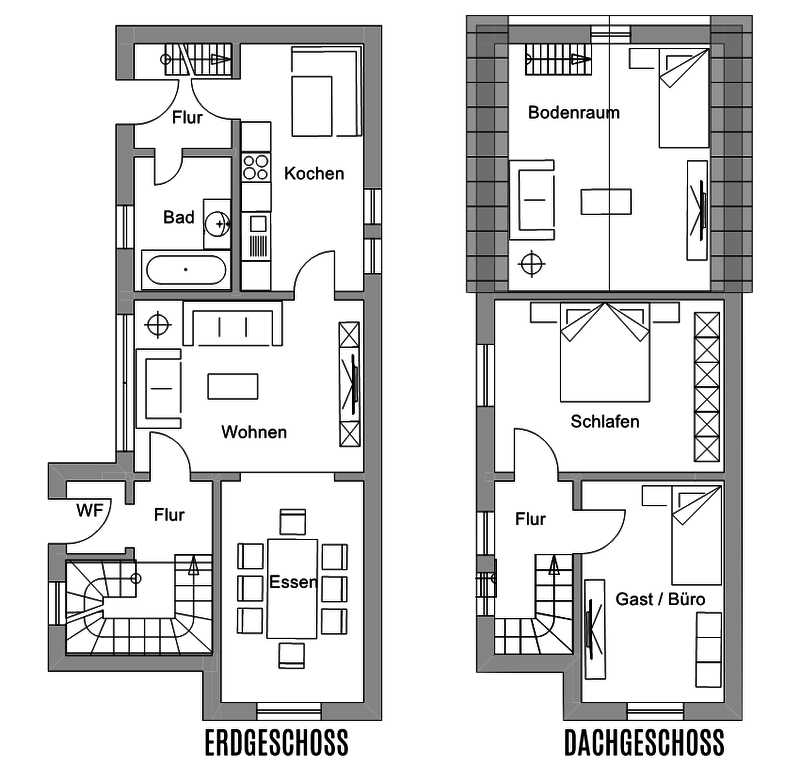 Die Grundrisse: Das Erd- und Dachgeschoss + Erd- und Kellergeschoss