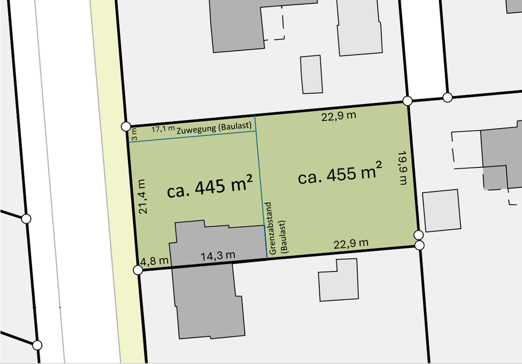 - ca. 900 m² großes Grundstück, teilbar zu ca. 2 x 450 m²