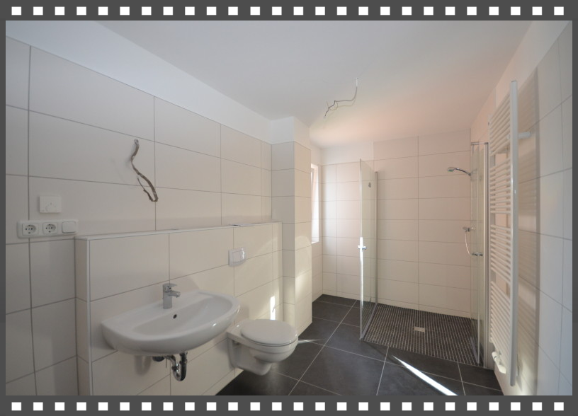 - Bad mit Fenster und großer, bodengleich gefließter Dusche