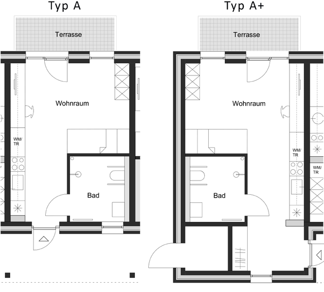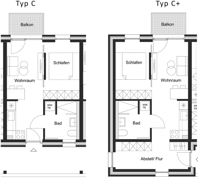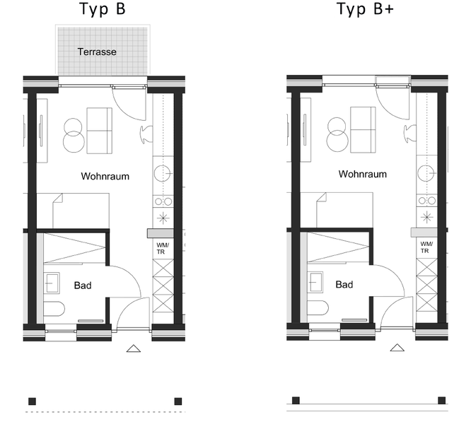 Die verschiedenen Wohnungstypen von ca. 24 m² bis ca. 41 m²:
