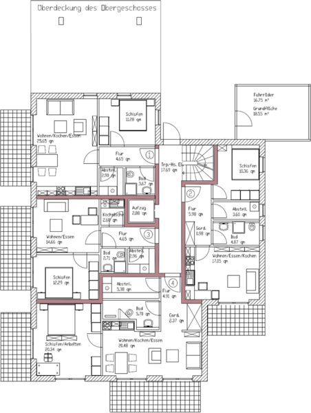 Wohnküche: | 25,65 m² | 17,05 m² | 13,36 m² | 20,48 m² | 31,29 m² |