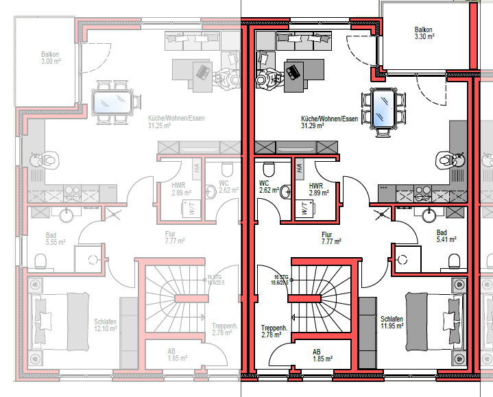 Balkon (50%): | 3,00 m² | 3,30 m² | 3,30 m² | 3,00 m² |