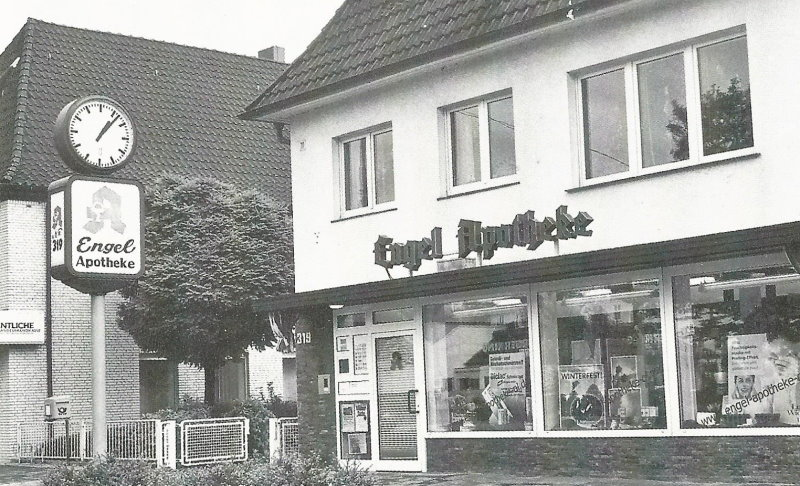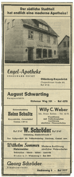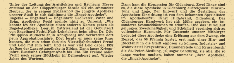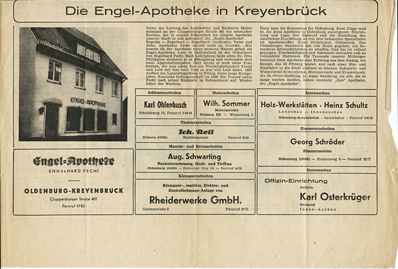 "Am 31.12.1953 gründete Engelhard Fecht in Kreyenbrück die Engel-Apotheke. Zunächst befand sich diese an der Cloppenburger Straße 401 in einem damals neu errichteten Gebäude. Zu der Zeit gab es noch keine Niederlassungsfreiheit für die Apotheken und so musste von der Bezirksregierung eine "Konzession" erteilt werden. Bis dahin hatten die Bümmersteder und Kreyenbrücker Einwohner ihre Rezepte in der Innenstadt einlösen müssen. Rezeptgebühr war damals 50 Pfennige pro Rezept. Schon bald waren die Räumlichkeiten zu klein. Seit 1963 befindet sich die Engel-Apotheke in der Cloppenburger Straße 319. Nachfolger von Engelhard Fecht war bis 1997 seine Tochter Inge Dore, seit 1998 wird sie geleitet von Carola Aßmann."