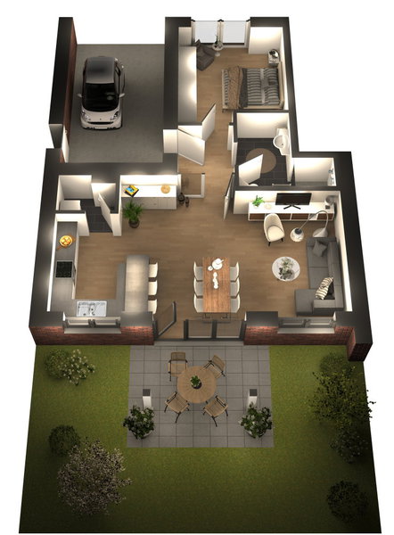 Der Grundriss & 3D-Grafiken einer bauähnlichen Gartenwohnung: