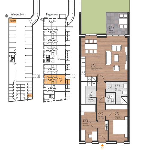 Der Grundriss + die Lage von PKW-Stellplatz & Kellerraum: